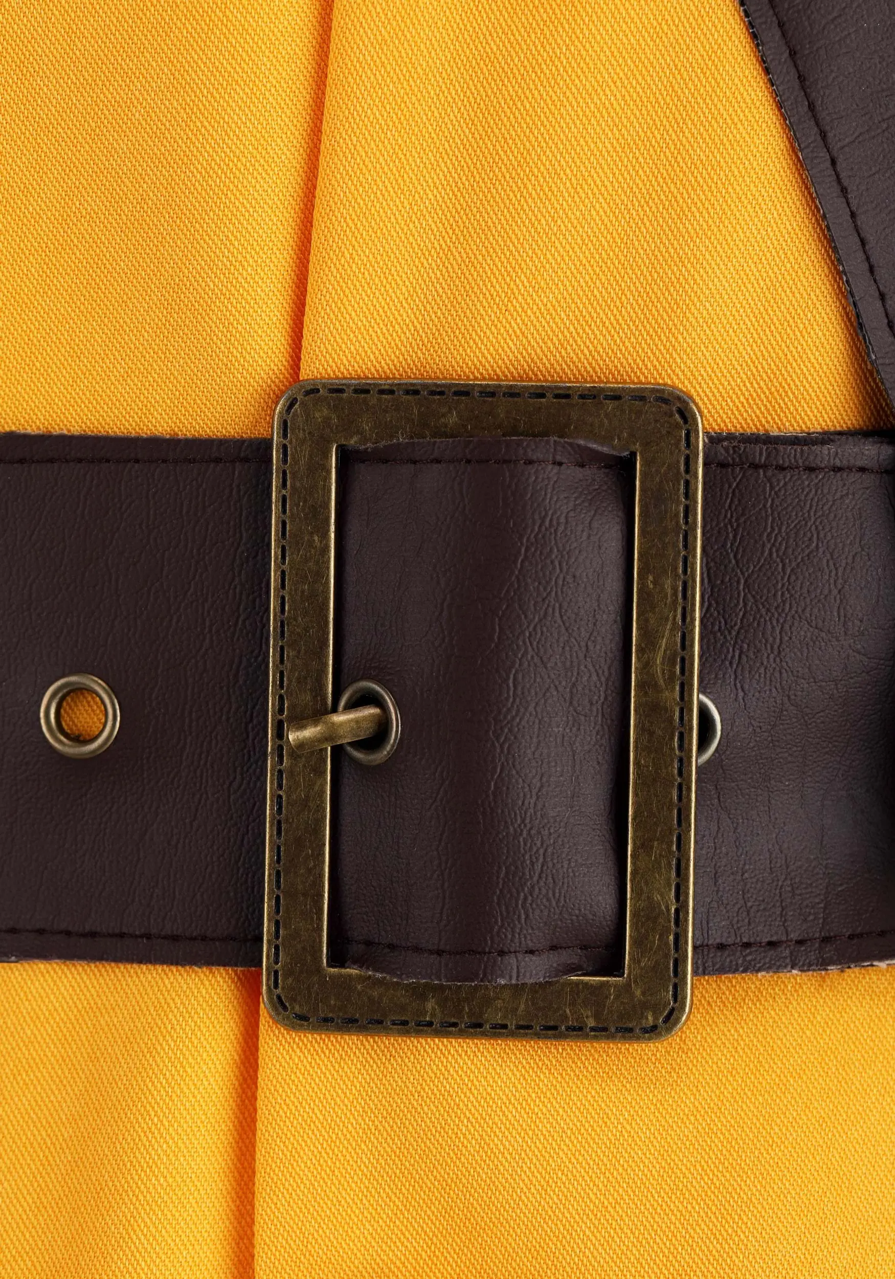 Fans of the Clue franchise will instantly recognize this Made By Us design. That bright yellow color, the mutton chops, and military medals are all signature parts of Colonel Mustard’s style! The costume starts with a yellow jacket that has gold-tone metallic buttons in front and embroidered campaign ribbons on the chest. The pants, made of the same fabric, are reminiscent of old military jodhpurs, with a baggy fit around the thighs and a tighter fit near the shins and ankles. The costume set also comes with a faux leather belt that fits around the waist and shoulder, and a yellow tie to match the jacket and pants. Of course, you need Colonel Mustard’s magnificent hair, which is why this costume comes with a self-adhesive synthetic facial hair piece. When you have the entire ensemble on, you’ll be ready to get to the bottom of things!