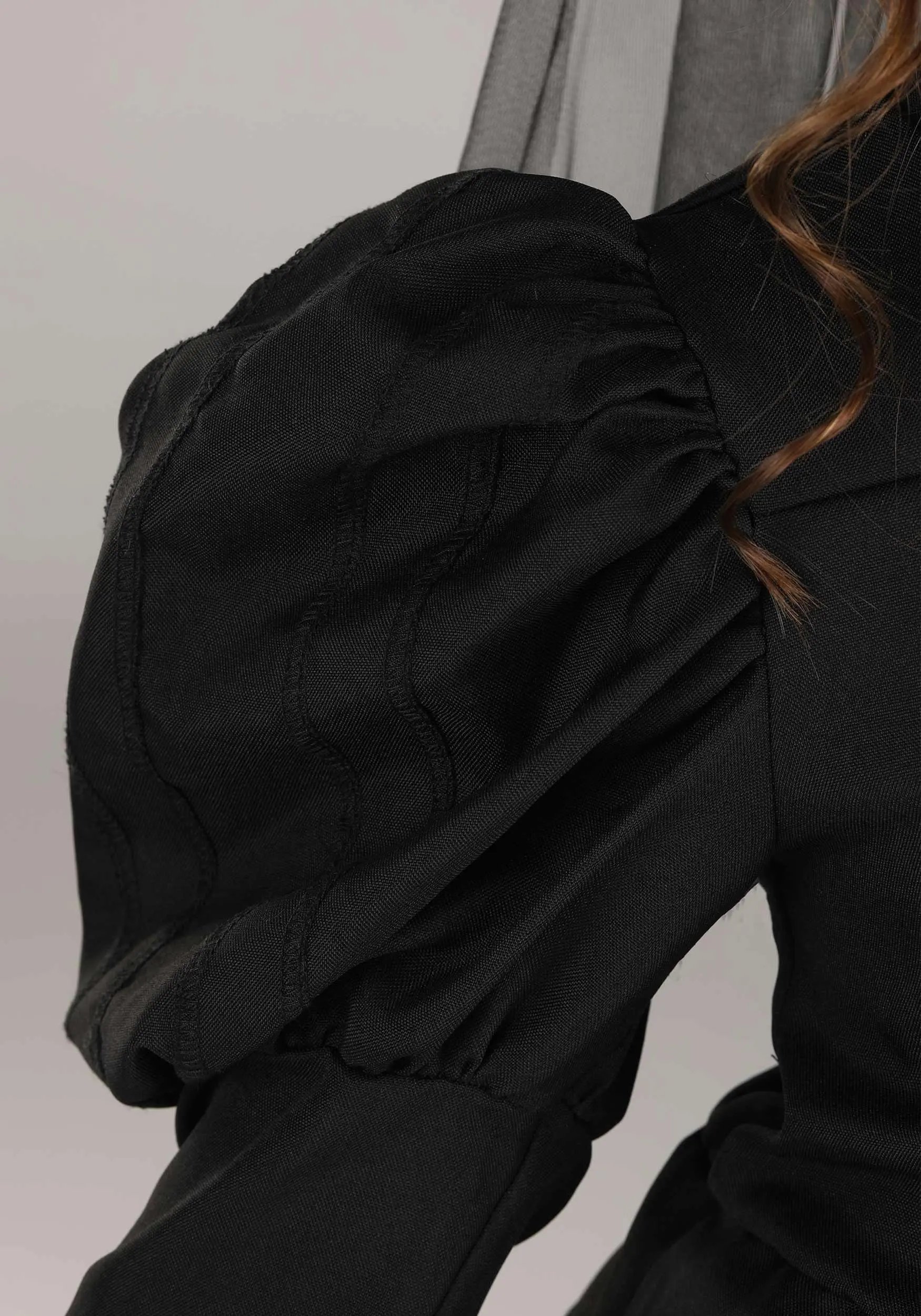 - Leg o’ mutton sleeves are puffed above elbow, fitted over forearms