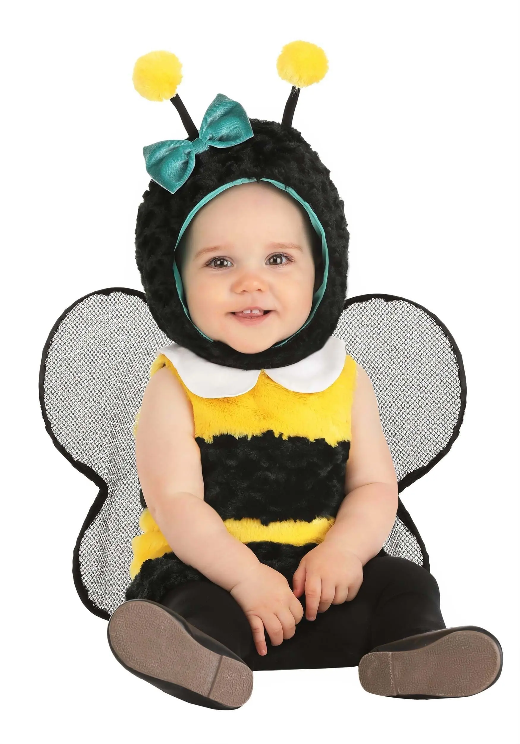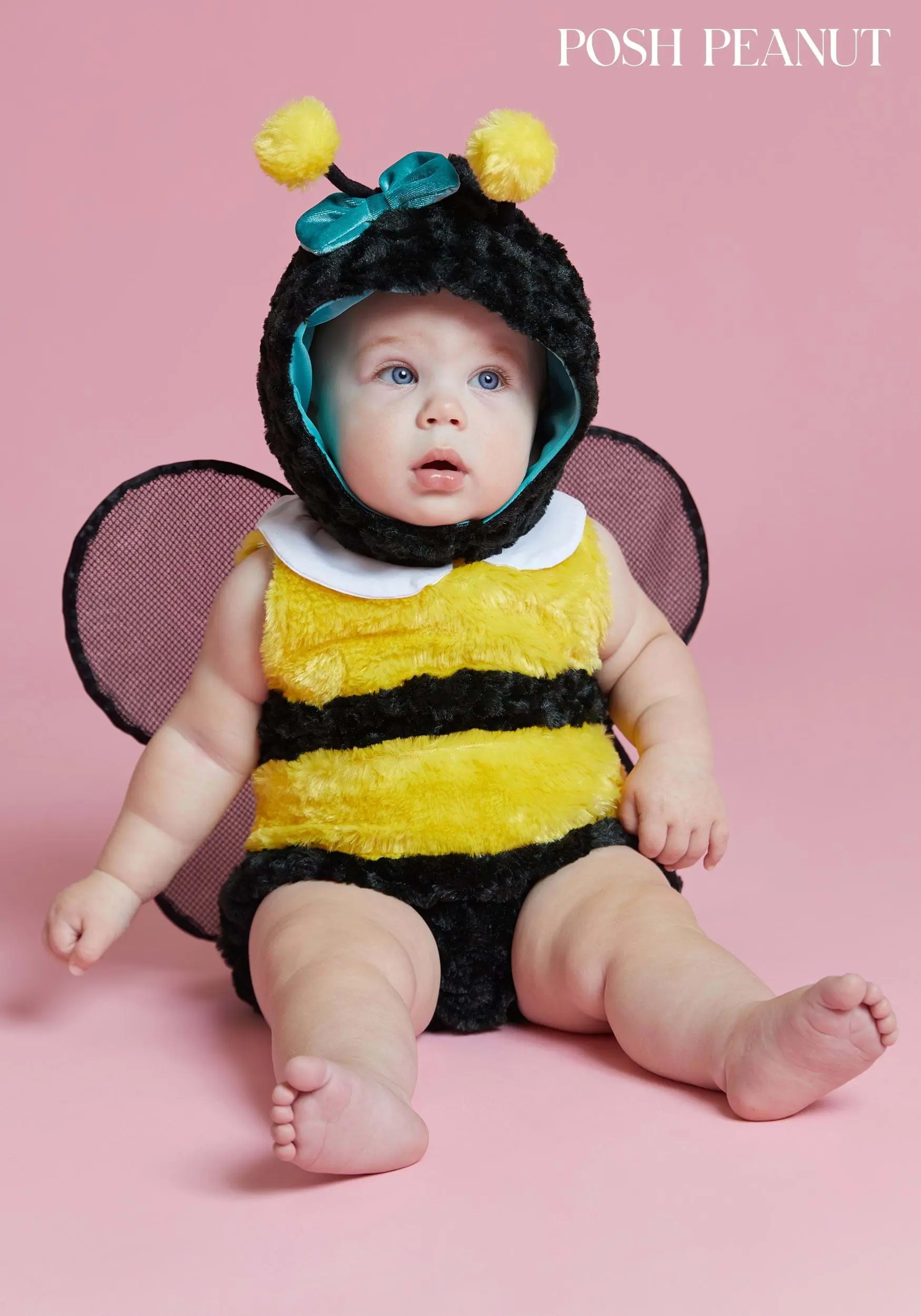 It’s time to save the world in the cutest way out there. Let your peanut take flight in this Posh Peanut Infant Beatrice Bumble Bee costume. This fuzzy romper is a black and yellow plush with a teal knit lining that zips down the back and features a stuffed stinger above the bum. An adorable white collar keeps your peanut looking cute and you can attach the shiny net wings to the back of the romper with hook and loop fasteners. The matching hood is foam-backed for shape, lined for comfort, and has puffy antennae you can bend.